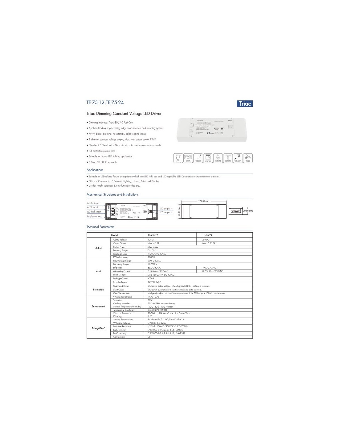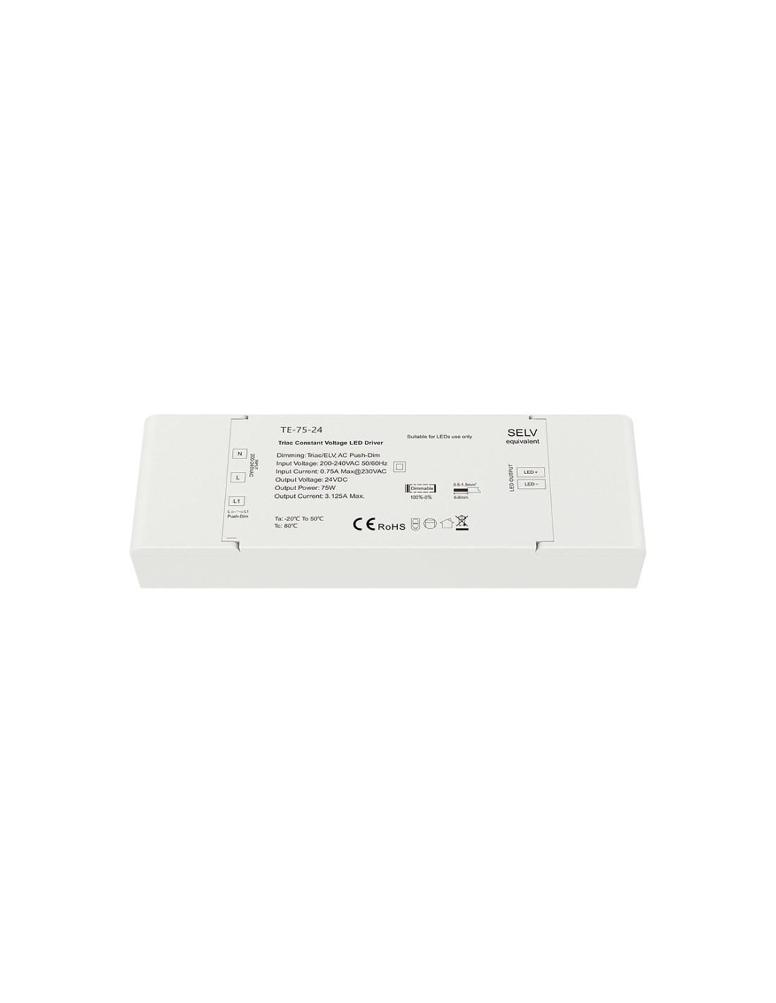Alimentatore Professionale serie TE da 75 watt a 24 V a tensione costante caratterizzato dalle funzioni dimming a taglio di fase e Push dimming, utile per la dimmerazione diretta delle strisce a Led utilizzando pulsanti push delle serie civili o tutti i dispositivi di dimmerazione Triac a taglio di fase, trailing e leading edge.